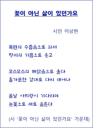 그런데 여기 이상현 시인은 그 어떤 이의 삶도 꽃이라고 노래한다. 내가 불러 주지 않아도 말이다. 그저 목련은 수줍음만으로도, 장미는 기쁨만으로도 꽃이란다. 작은 꽃 한 송이에 지나지 않지만, 그 한 송이에 사람들이 위로를 느끼기 때문일까? 아니 그냥 꽃 한 송이로도 아름답지만, 빨간꽃, 하얀꽃, 노란꽃 등 여럿이 함께하면 그 자체로도 이 세상은 더없이 아름다운 꽃천지가 되고 사람들이 살만한 세상이 되는 것이다.