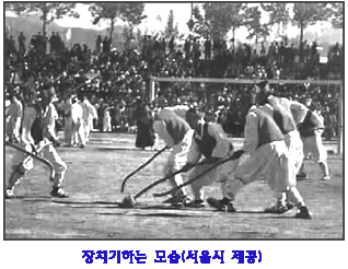 낭자들은 하나둘이 아닙니다. 그런데 우리나라에 장치기라는 골프 또는 하키와 비슷한 놀이가 있음을 아시나요?장치기는 다른 말로 타구(打毬), 격구(擊毬), 포구(抛毬), 장구(杖毬), 봉구(棒毬)라고 하는데 1미터 정도의 단단한 나무를 끝이 구부러지게 하여 공을 치기 편리하게 만든 놀이채로 소나무의 옹이가 있는 부분이나 고양 나무, 박달나무와 같이 굳은 나무를 둥글게 깎아서 만든 공을 쳐서 구멍에 넣는 놀이입니다. 삼국 시대부터 조선시대에 걸쳐 행해진 전통 민속놀이지만 오늘날에 와서는 거의 자취를 감추었습니다. 장치기는 군사들의 훈련과 조정 대신들의 여가 선용을 위한 사교용 놀이였다가 일반 백성에게 널리 퍼졌으며 또 건강을 위한 것이기도 했음이 기록에 있습니다.