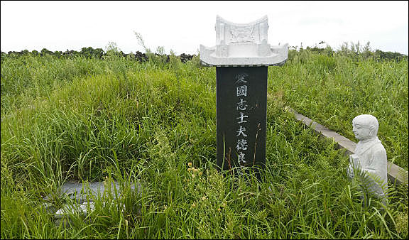 | ▲ 부덕량 애국지사 무덤 돌비석, 멀리서 보면 무덤은 풀 속에 묻혀있어 안보이고 비석만 있는 것처럼 보인다. |