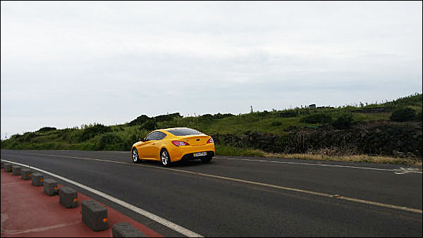 | ▲ 왼쪽이 문주란섬이 있는 바다이고 오른쪽 노란차가 달리는 낮은 풀 언덕에 무덤이 숨어 있어 찾기가 어렵다 |
