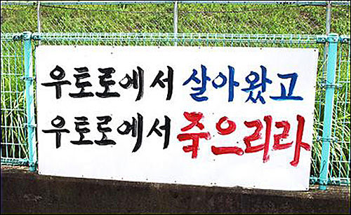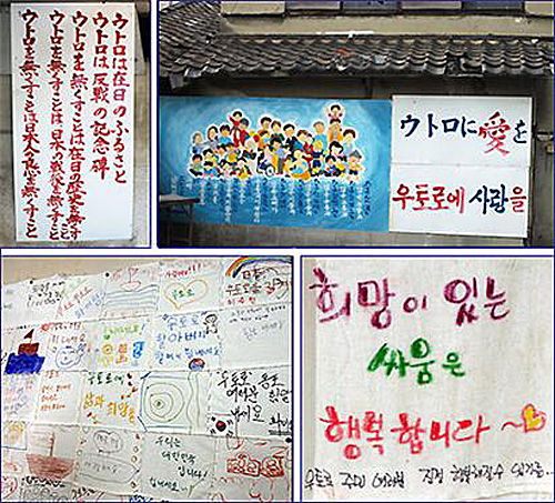 | ▲ 우토로마을 안길 담장 등에 붙은 여러 가지 구호와 외부 격려 글들, 윗줄 왼쪽에는 “우토로를 없애는 것은 일본의 양심을 없애는 것” 등의 구호가 일본어로 쓰여 있어 그동안 우토로 마을이 겪어왔을 고통의 흔적이 보인다 <2010년 8월 사진> | ||