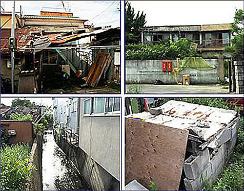 ▲우토로마을 골목에서 본 것들 / 다 쓰러져가는 집, 이 마을엔 저렇게 빈집이 많아 살지 못할 마을임을 드러낸다. 마을 주민이 공동으로 사용하는 우물, 일본인 마을과의 사이에 있는 작은 도랑 <2010년 8월 사진>