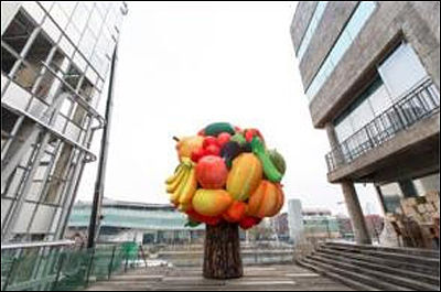 [우리문화신문 = 전수희 기자] 청계9가에 지상 7m의 거대한 과일나무가 나타났다. 서울문화재단(대표이사 조선희)은 뻔한 서울을 펀(Fun)한 서울로 만드는 <도시게릴라 프로젝트>의 일환으로 청계9가에 위치한 재단 청사 2층에 설치예술가 최정화(54)의 공공미술 조형물 ‘과일나무’를 설치해 일반에 공개했다고 4일 밝혔다.