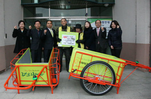 [우리문화신문 = 전수희 기자] 추운 겨울 폐지를 주워 생활해야하는 어르신들께 크나큰 선물이 배달되었다. 다름아닌 한화테크윈 소속 명장들이 경남 창원 공장에서 만든 ‘사랑의 리어카’가 그것이다. 이 리어카 2대가 1월 28일 오후 5시 성남시 분당구 자원봉사센터로 배달된 것이다.