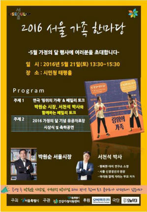 [우리문화신문 =전수희 기자] 서울시는 5월 가정의 달을 맞이하여 오는 5월 21일 시민청 태평홀에서 온 가족이 참여할 수 있는 ‘2016 서울 가족한마당’을 연다.
