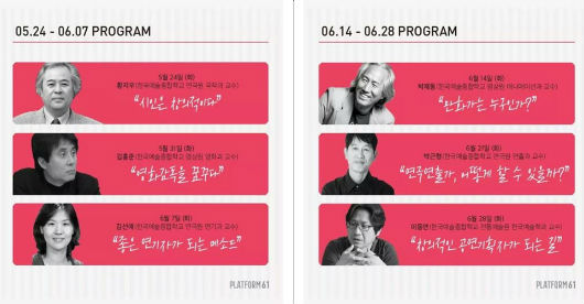 교수진은 「플랫폼 창동 61」의 총괄예술감독인 이동연(한국예술종합학교 전통예술원 한국예술학과교수)을 비롯해 김홍준(한국예술종합학교 영상원 영화과 교수), 김선애(한국예술종합학교 연극원 연기과 교수), 박재동(한국예술종합학교 영상원 애니메이션과 교수), 박근형(한국예술종합학교 연극원 연출과 교수) 등이 진행한다.