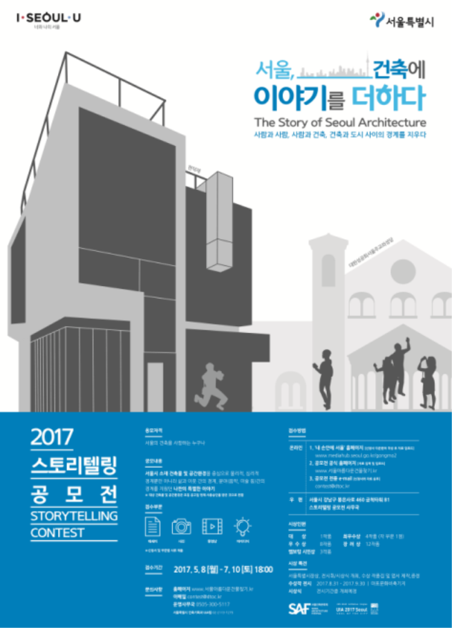 서울시는 이와 같은 내용으로 5.8(월)~7.10(월)까지 『서울, 건축에 이야기를 더하다.』스토리텔링 공모전을 진행한다고 밝혔다. 선정되는 건축 작품에 대해서는 수상 작품집 및 엽서를 제작하여 증정하며, 건축물이 갖는 특성과 역사성 등을 널리 홍보해 관광자원으로 활용할 계획이다. 또한 수상자에겐 서울특별시장상을 시상하고 수상작들은 ‘2017 서울건축문화제’(9.1~9.24)와 연계해 전시도 할 예정이다.