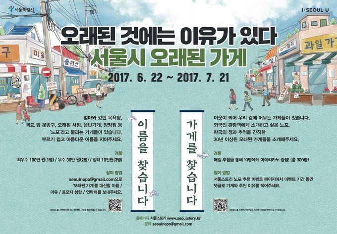 공모전과 함께 진행되는 ‘오래된 가게를 찾습니다’ 이벤트는 시민이 직접 서울의 노포를 추천하는 것으로 온라인플랫폼 서울스토리(www.seoulstory.kr)에서 22일부터 응모 가능하다. 추천하는 노포와 그 이유를 올리면 추첨을 통해 매일 10명 총 300명에게 커피 기프티콘도 증정한다.