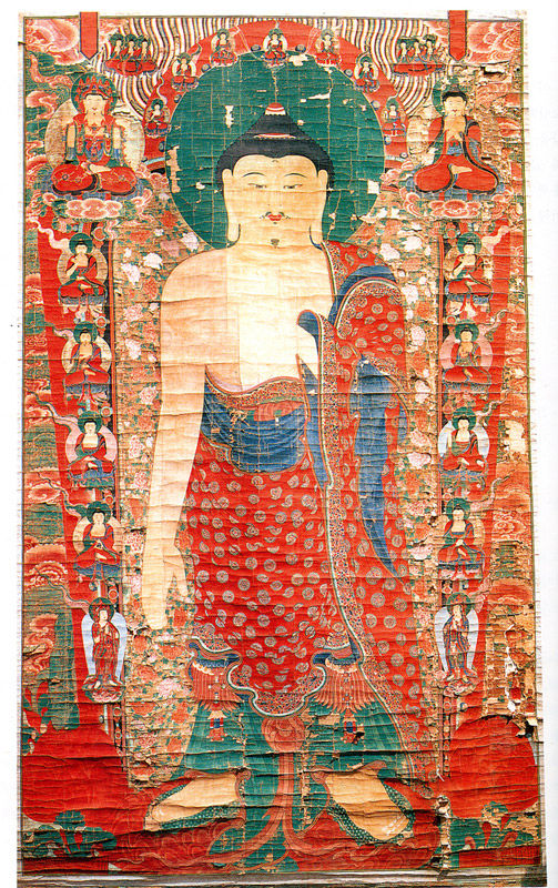 화면을 가득 채운 석가불은 오른쪽 어깨가 드러난 우견편단의 옷을 걸치고 화면 중앙에 서 있으며 둥근 얼굴, 비대한 어깨, 유난히 길고 굵은 팔, 짧은 하체가 비현실적으로 보인다. 옷에는 둥글고 변형된 덩굴무늬가 빽빽하게 장식되어 있고, 석가모니불 뒤의 광배에는 모란 줄기와 연꽃무늬 등이 새겨져 있다.