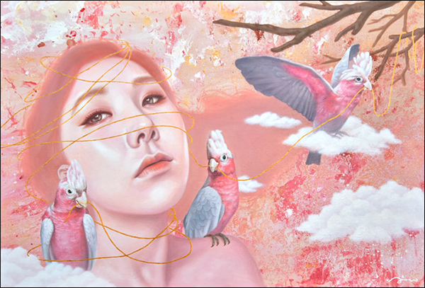 “작품 속에 등장하는 얇은 선들은 나를 둘러싸고 억압하고 있는 것을 가시적으로 표현한 것이며, 이는 내면의 혼란과 갈등을 시각화한 요소라고 할 수 있다. 또한 작품 속에 등장하는 새는 ‘자유’의 상징이며, 억압된 현실과 상반되는 존재이기도 하다. 새는 갇힌 공간에서 틀을 깨고 벗어날 수 있게 도와주는 내면의 ‘자아’로서 등장한다.