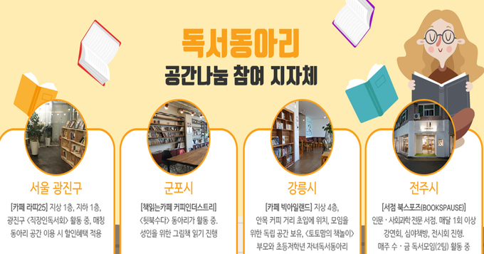 사업 첫 해인 올해는 풀뿌리 독서문화 확산에 앞장서 온 4개 지자체 ▲ 군포, ▲ 강릉, ▲ 광진, ▲ 전주에서 시범적으로 사업이 실시된다. 각 지자체와 도서관은 사업에 활용할 수 있는 참여 공간을 연중 모집하고 있다. 이번 사업에 참여할 수 있는 공간은 작은 도서관과 주민센터부터 카페, 갤러리, 서점, 종교시설, 체육시설, 사회적 기업에 이르기까지 특별한 제한은 없지만, 7인 이상 모임이 가능한 독립공간이어야 한다.