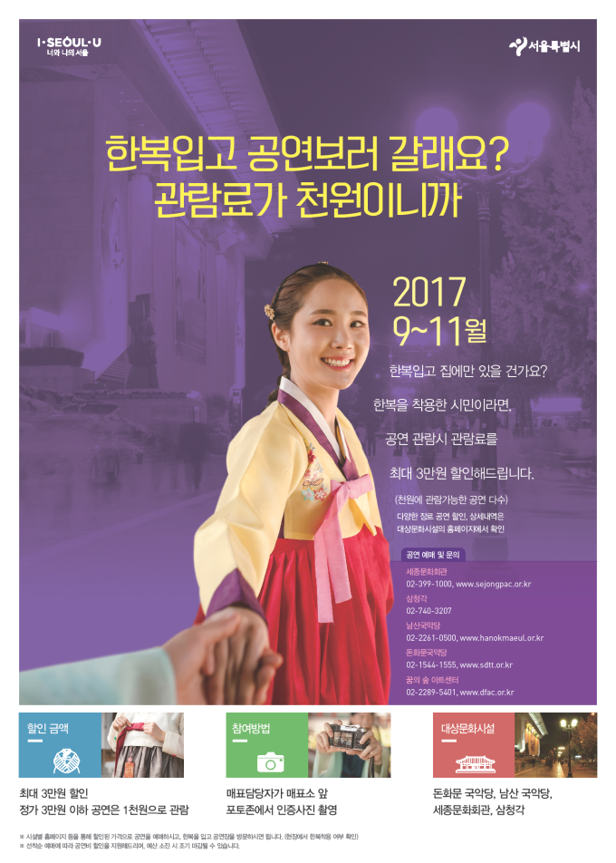 서울시는 ‘일상 속에서 한복입기’ 문화를 장려하고자, 한복을 입고 시에서 운영하는 문화공연 시설에 방문하면, 입장료를 최대 3만원 할인해주고, 3만원 이하 공연은 천원으로 관람할 수 있다. 오는 9월부터 11월까지 세종문화회관, 남산 국악당, 서울돈화문 국악당 등 에서 열리는 21개의 명품 문화공연을 저렴한 가격으로 즐겨보자.