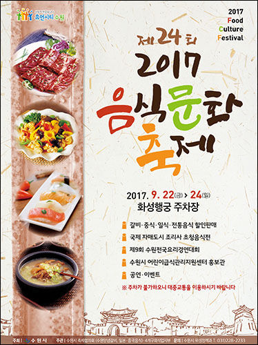 올해 음식문화축제에는 갈비 전문점 9개소, 중식 8개소, 일식 7개소 등 28개소가 참여한다. 독일 프라이부르크시, 호주 타운즈빌시 등 수원시의 7개 자매도시에서 방한한 요리사가 자국 요리를 즉석에서 선보이는 ‘국제자매도시 조리사 초청 음식전’도 열린다.