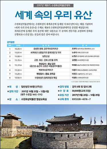 교육장소, 세부일정, 강사진 등 자세한 사항은 수원화성박물관 누리집(http://hsmuseum.suwon.go.kr)에서 확인할 수 있다.