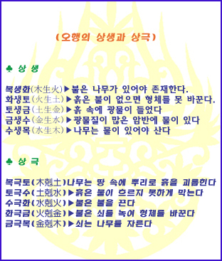 상생과 상극은 무엇일까요?오행을 한자로 쓰면 음양이 걸어가는 다섯 가지 걸음을 뜻합니다. 오행은 나무(木), 불(火), 흙(土), 쇠(金), 물(水) 이 다섯 가지의 관계와 변화에 대한 이론을 체계화한 것을 말하며, 행(行)은 고정되지 않고 변화한다는 뜻을 말하지요. 또 상생(相生)은 서로 도와 이롭게 하는 것이고, 상극(相剋)은 서로 맞서거나 해를 끼치는 것입니다. 예를 들면 ‘목생화(木生火)’는 불은 나무가 없으면 존재할 수 없다는 뜻이고, 수생목 (水生木)은 나무는 물이 있어야 산다는 뜻입니다. 또 ‘수극화(水剋火)’는 물을 타오르는 불을 끄는 것이며, ‘금극목(金剋木)’은 쇠는 나무를 자른다는 뜻을 말합니다.
