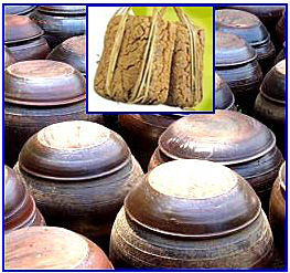 겨울을 된다는 믿음이 전해집니다. “부네야 네 할 일 메주 쑬 일 남았도다 / 익게 삶고 매우 찧어 띄워서 재워두소” 이는 ‘농가월령가’ 가운데 십일월령에 있는 노래입니다. 농사일을 끝내고 한가해지는 이때는 콩을 쑤어 온갖 정성을 기울여 둥글넓적하거나 네모지게 메주를 만듭니다. 이렇게 만든 메주를 며칠 방에 두어 말린 후, 짚을 깔고 서로 붙지 않게 해서 곰팡이가 나도록 띄웁니다. 알맞게 뜨면 짚으로 열십자로 묶어 매달아 두는데 짚을 사용하는 까닭은 메주를 띄우는 푸른곰팡이의 번식이 왕성하도록 하기 위함이지요.