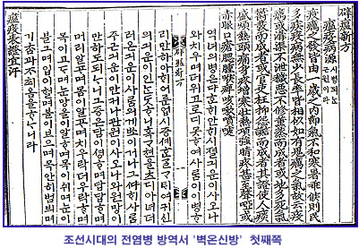 옛날에 전염병이 돌면 어떻게 대처했을까요?조선시대 효종 때인 1653년 봄 황해도에 문둥병이 크게 유행하여 사망자가 발생하자 임금이 어의 안경창에게 명하여 당시에 유행하는 전염병의 특성과 조선의 실정 등을 면밀히 검토한 뒤 풍토와 조선인의 체질에 알맞은 치료법을 담은 책을 펴냈습니다. 이 책이 바로 ‘벽온신방(壁瘟新方)’으로 전염병과 기근 등 재난에 대비한 방역 전문서입니다. 이 책은 일반 백성들이 쉽게 이해할 수 있도록 한글 언해를 붙여 놓았으며, 조리법이나 전염예방법도 민간에서 간편하게 행할 수 있는 방법들을 기록해 놓았습니다.
