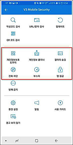 이 밖에도 개인정보보호 도우미, 개인정보 클리너 등 V3 모바일 시큐리티의 기능을 활용해 평소에도 슬기전화에 저장된 개인정보를 보호할 수 있다. V3 모바일 시큐리티는 구글 플레이에서 무료로 내려받을 수 있다.