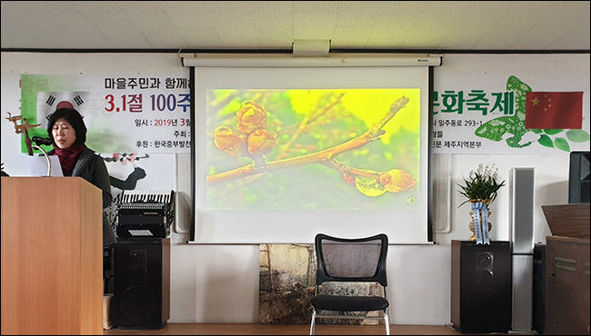 제주도 삼양동의 한라마을도서관(옛 한라민속박물관)에서 제주지역의 시인, 시낭송가, 사진작가, 서각가, 캘리그라피 작가들과 의회의원, 동장, 마을회장, 각 사회단체 및 지역주민 등 150여 명이 참가한 가운데 시작된 행사는 애국가 제창, 순국선열에 대한 묵념, 제주 및 중국시인의 3.1절 기념 시낭송이 이어졌고, 제주지역의 가장 큰 사회적 문제인 쓰레기 재생문제도 고민하는 환경문화제도 함께 열었다.