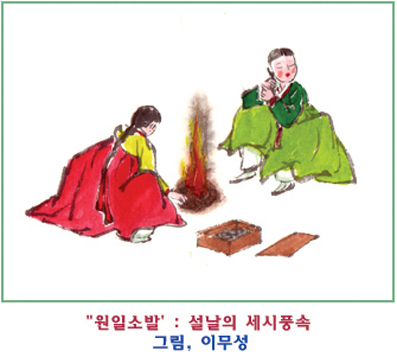 하녀를 서로 보내 새해 문안을 드리는데, 이 하녀를 '문안비'라 합니다. 벽 위에 닭과 호랑이의 그림을 붙여 액이 물러가기를 빌고, 설날 새벽에 거리에 나가 맨 처음 들려오는 소리로 1년간의 길흉을 점쳤는데, 이것은 '청참'입니다. 나무에 오행인 금, 목, 수, 화, 토를 새겨 장기쪽 같이 만들어 이것을 던져서 나온 것으로 새해의 신수를 점치는 것은 '오행점'이라 했습니다. 또 ‘원일소발’이란 것도 있는데 지난 한해 동안 빗질할 때 빠진 머리카락을 모아 상자 안에 넣어 둔 것을 설날 저녁에 문밖에서 태우는 풍습입니다. 머리카락을 태울 때 나는 냄새로 악귀나 나쁜 병을 물리친다는 믿음이지요.