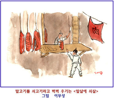 사람은 다 압니다. 이렇게 뻔한 사실을 놓고 벅벅 우기는 것을 ‘말살에 쇠살’이라고 합니다. 푸줏간에 고기를 사러 갔는데 벌건 말고기를 쇠고기라고 내놓습니다. 누가 보아도 가짜여서 따지면 주인은 쇠고기라고 뻔뻔스럽게 우깁니다. 번연히 사실이 아닌 것을 사실이라고 우기거나, 논리적으로 맞지 않는 말을 할 때 우리 토박이말로 ‘말살에 쇠살’이란 말을 쓰는 것입니다. 요즘 정치인들도 ‘말살에 쇠살’ 같은 언행을 하는 사람이 많은데 이때도 쓰면 좋지 않을까요?
