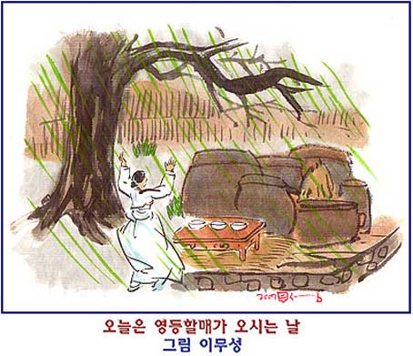 생각합니다. 그런데 이날 바람이 불면 딸을 데리고 오는 것으로 딸이 차려입은 치마가 나풀대어 더 예쁘게 보이기 위해 바람을 불게 하며, 흉년이 든다고 믿습니다. 만일 비가 오면 며느리가 곱게 차려입은 명주치마를 얼룩지게 하기 위하여 비를 오도록 하는 것으로 풍년이 든다고 생각합니다. 그래서 사람들은 며느리를 데리고 오게 하기 위하여 초하룻날 부엌에 떡을 쪄서 먹는 등 많은 음식을 차려놓고 빌었습니다. 또 초하룻날 첫 새벽에 세 곳의 샘물을 떠서 장독대에 짚을 깔고 상위에 올려놓습니다.