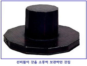 이렇게 조선시대 사대부들은 양반의 표시이기도 했던 갓을 소중히 생각하여 쓰지 않을 때에는 갓집에 고이 모셔놓았지요. 갓집의 형태는 보통 두 가지인데 하나는 겉모습이 갓과 비슷한 형태로 만든 것이고, 다른 하나는 원추형으로 만들었습니다. 이 사진에 보이는 갓집은 덮개가 갓과 비슷하게 만들었는데, 밑바닥은 원, 사각, 팔각, 12각형 등입니다.