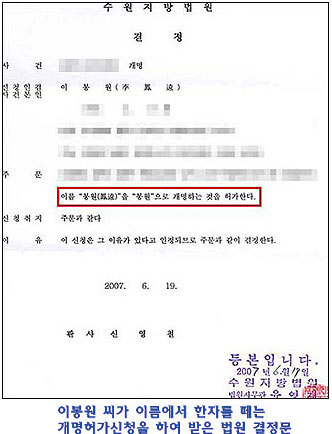약자(간체자)가 돼 버린 것이다.”이에 민족문제연구소 이봉원 운영위원장은 한자이름이지만 한자를 떼버리겠다고 생각하고, <李鳳遠>이 아닌 <이봉원>으로 해달라고 법원에 개명신청을 하여 허가를 받았습니다. 나이가 어느 정도 들어 사회생활 그것도 창작생활을 오래 해왔기에 전혀 다른 이름으로 바꾸면 남에게 다소 혼란을 줄 수가 있고, 또 이것저것 다 고치려면 매우 번거롭기도 할 것이기 때문에 한말글(한글과 한국말) 이름으로 바꾸는 대신에 쓰고 있던 한자이름에서 한자만 떼어버린 것입니다. 그래서 그는 정체성과 자존심을 지키려 한 것이지요.