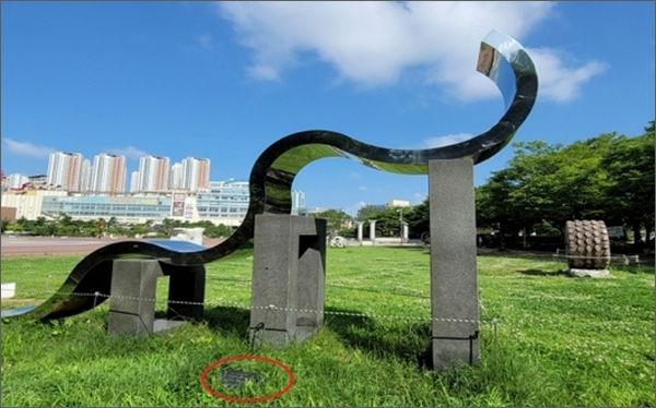 강현석 시장 때인 2006년이란 지금부터 무려 17년 전 이야기다. 그래서 그런지 호수공원에는 곳곳에 조각작품들이 놓여 있다. 하지만 기자가 조사한 바에 따르면 유독 이곳 조각공원(노래하는 분수대 입구, 제1주차장 근처)의 작품에만 이런 어처구니없는 모습인 것으로 파악된다.