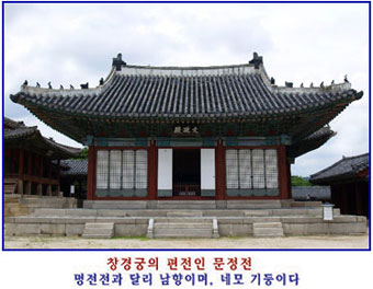 명전전은 동향이며, 기둥이 둥근데 반해 문정전은 남향이고 네모 기둥입니다. 그