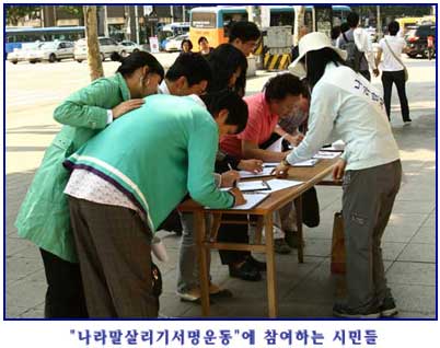 사람이 더 많았다고 합니다.언어 철학자인 박영식 전 문교부장관은 “한 명문대 교수가 일본 유명대학에 가서 우리 학교는 영어강의가 30%인데 앞으로 50%까지 늘일 예정이라고 했더니 일본인 교수는 우리는 별로 그럴 생각이 없다고 말했다. 그것이 무엇을 뜻하는지 생각할 필요가 있다. 우리가 세계화 바람 속에 살아남으려면 우리 것, 우리말을 명품으로 만들어야 한다.”고 강조했습니다. 한글날을 맞아 온종일 “나라말지키기서명운운동”을 하면서 격려를 주시는 시민들에게 용기를 얻기도 했지만 영어 때문에 짓밟히는 우리말을 생각하면서 가슴이 아팠습니다.