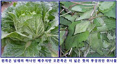 "산사 옆에 잘 가꿔놓은 남새밭 / 몇 가지 종류의 푸성귀 얌전히 앉아 있다." (문병란의