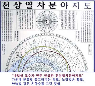 사람에게는 무용지물이었지요. 그런데 최근 이를 한글판으로 번역해 그린 천문도가 나와 화재입니다. 국제천문연맹 천문학사위원회 위원장인 연세대 나일성 명예교수는 “한글판 천상열차분야지도”를 그려 일반에 공개했는데 무려 25년의 삶을 바친 역작입니다. 나교수에 의하면 이 천문도에는 서양 과 달리 왕궁을 중심으로 직제와 직위를 별자리 이름으로 했는데 재미있는 것은 뒷간이나 창고 이름도 들어 있다고 합니다. 이 천문도에서 뒷간별을 찾아보는 것도 재미있을 것입니다.