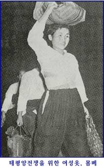 했으며, 여학생 교복으로도 입게 합니다.당시 언론들도 이 일제의 몸뻬 정책에 적극적으로 협력했습니다. 매일신보 1942년 6월 13일 자는 “몸뻬는 조선 부인이 입는 옷과 비슷한 점이 많다.”라고 했으며, 잡지 ‘신여성’ 1944년 11월호는 “나라가 원하는 여성이란 근검과 절약을 실천하고, 나라와 사회를 위해 자기의 욕구를 기꺼이 희생하는 사람”이라며 몸뻬 입기를 부추겼습니다. 해방 뒤에도 일할 때 좋다고 여전히 이 태평양전쟁을 위한 옷, 몸뻬를 입는 사람이 있었지요.