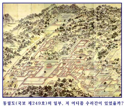 부르지요. 임금과 왕비의 이 수라를 만드는 곳을 수라간(水剌間) 또는 소주방(燒廚房)이라고 하며, 침전과는 별채로 떨어져 있습니다. 수라상을 올릴 때는 퇴선간(退膳間)에서 상을 차리고 물린 상을 정리하며, 후식은 생과방(生果房)에서 만들어 올립니다. 그밖에 궁중의 연회 때에는 임시로 지은 주원숙설소(廚院熟設所, 內熟說所), 또는 행주방 (行廚房)에서 조리를 합니다. 궁중에서 평상시의 수라상에 올리는 음식을 조리하는 일은 주로 주방상궁들이 만들었으며, 궁중의 잔치인 진연, 진찬 때는 대령숙수라고 하는 남자조리사들 몫이었습니다.
