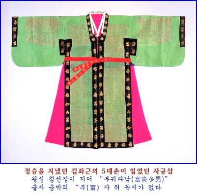 그런가 하면 왕가나 명문세도가는 금박무늬를 새길 수 있었는데 오늘날 정신없는 사람들이 흔히 말하는 '럭셔리(luxury)'일까요? 그러나 임진왜란 뒤 신흥 양반이 급격히 늘어나면서 일반인들도 금박무늬를 옷에 새길 수 있게 됐습니다. 사진의 사규삼은 정승의 후손이 입었던 것인데 왕실에서 바느질을 하던 침선장이 지은 것입니다. 그 증거로 왕실의 금박장은 “부귀다남(富貴多男)”이란 글자를 찍을 때 '富' 자의 위 꼭지를 찍지 않았다고 합니다.