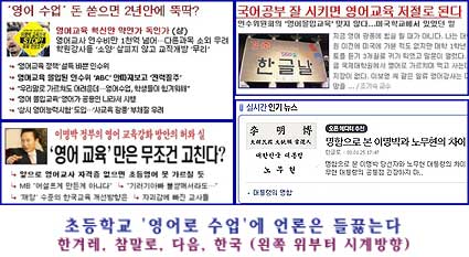 수 있는 마법 주문, 영어!” 위는 데일리서프라이즈라는 인터넷신문에 문화평론가 하재근 씨가 올린 글입니다. 그는 인수위의 영어 정책이 한국사회 경쟁력을 떨어뜨리고, 한국인은 영어능력만 기이하게 비대해져 지식경쟁력이 약화할 것이라고 예언합니다. 인수위 사람들은 그들만의 부귀 세습을 위해 국민 소리를 듣지 않으려 귀를 막고 있다는 생각이 듭니다.