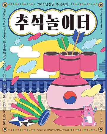 [우리문화신문=김영조 푸른솔겨레문화연구소장]  □ 서울시 중구 남산골한옥마을(중구 퇴계로34길 28)에서 오는 10월5일(일)부터 10일(금)까지, 한가위 연휴를 맞아 전통놀이와 공연, 공예체험이 어우러진 2025 남산골 한가위 잔치 <한가위 놀이터>, <지구촌판소리페스티벌>, <이북5도 무형유산 대축제>가 열린다.