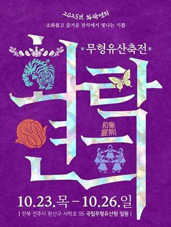 [우리문화신문=정석현 기자] 국가유산청 국립무형유산원(원장 박판용)은 10월 23일 저녁 5시 개막식을 시작으로 26일까지 국립무형유산원(전북 전주시)에서 다양한 무형유산을 한 자리서 경험할 수 있는 무형유산 종합축제 「2025년 무형유산축전, ‘화락연희’」(이하 ‘축전’)를 연다. 전통과 현대, 스승과 제자, 세대와 세대, 그리고 지역과 세계가 어우러지는 마당으로 기획된 이번 축전은 관객 참여형 프로그램과 첨단 기술을 결합해 무형유산의 현재와 미래를 한자리에서 제시한다.