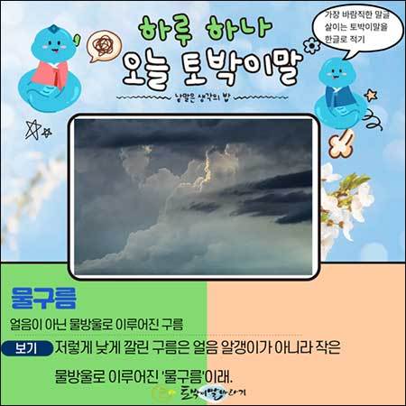 오늘 우리가 함께 나눌 토박이말은 그 이름처럼 참 숨김없이 맑은 느낌을 주는, '물구름'입니다.