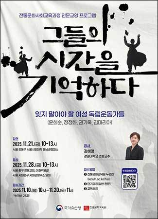 [우리문화신문=이한영 기자] 국가유산청 한국전통문화대학교 전통문화교육원(원장 김용구)은 오는 11월 21일(금)과 28일(금), 2회에 걸쳐 2025년도 인문교양프로그램 「그들의 시간을 기억하다 - 잊지 말아야 할 여성 독립운동가들」을 운영한다. 이번 프로그램은 광복 80돌을 맞이하여 여성 독립운동의 숭고한 정신과 역사적 의미를 되새기기 위하여 마련되었다.