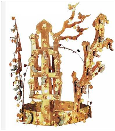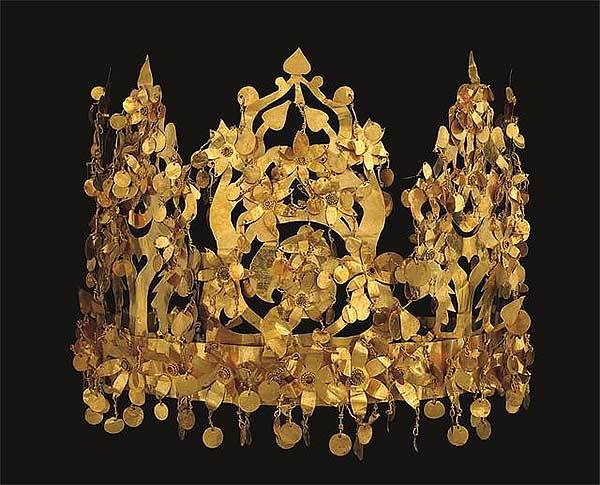 1978년 아프가니스탄의 '틸리아 테페'(황금의 언덕) 유적에서 신라금관과 영락과 나무기둥 등 여러 의장이 비슷한 금관이 출토되어 이 금관과 신라 금관과의 관계에 대해 궁금증이 일어났다. 이곳은 기원전 1세기쯤 조성된 박트리아 왕국의 무덤이어서 그 먼 나라와 우리 신라의 금관이 그렇게 비슷할 수가 있느냐는 것이다. 아무튼 전 세계에 지금까지 출토된 순금 왕관은 모두 13점이고 그 절반인 6점이 우리나라에서 나왔으니 우리나라는 말 그대로 '황금의 나라'였던 것 같다.
