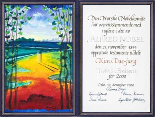 「김대중 대통령 노벨평화상 메달 및 증서」는 김대중 대통령이 한국과 동아시아 민주주의와 인권 신장, 특히 남북 평화와 화해를 위해 노력한 업적을 인정받아 2000년 한국인 처음으로 받은 노벨평화상 메달과 증서로 역사적 값어치가 크다.