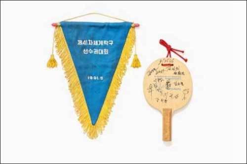 「제41회 지바 세계탁구선수권대회 남북단일팀 기념물」은 1991년 사상 처음으로 구성된 남북단일팀 탁구선수단이 사용한 서명 탁구채와 삼각기(페넌트)다. 탁구채에는 당시 참여했던 남북선수단 전원의 서명이 담겨 있으며, 삼각기(페넌트)에는 남북의 단일을 뜻하는 ‘KOREA’와 한반도기가 새겨져 있는데, 이 한반도기는 이후에 구성된 남북단일팀에서도 계속 사용되는 등 남북 화합과 협력의 의미를 담고 있다.