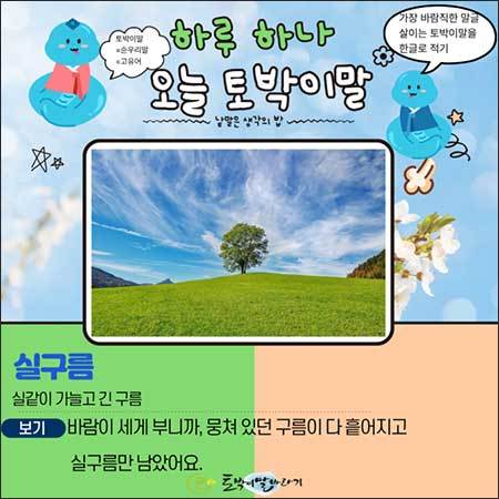 [우리문화신문=이창수 기자] 더없이 맑고 파란 하늘을 올려다볼 때, 누군가 하얀 솜에서 가느다란 실 한 올을 쭈욱 뽑아 하늘에 길게 그어 놓은 듯한 구름을 만날 때가 있습니다. 바람결을 따라 흘러가는 그 가느다란 구름의 모습은 바라보는 이의 마음까지 차분하게 만드는 힘이 있지요. 오늘 우리가 함께 나눌 토박이말은 바로 이 모습 그대로의 이름을 가진, '실구름'입니다.