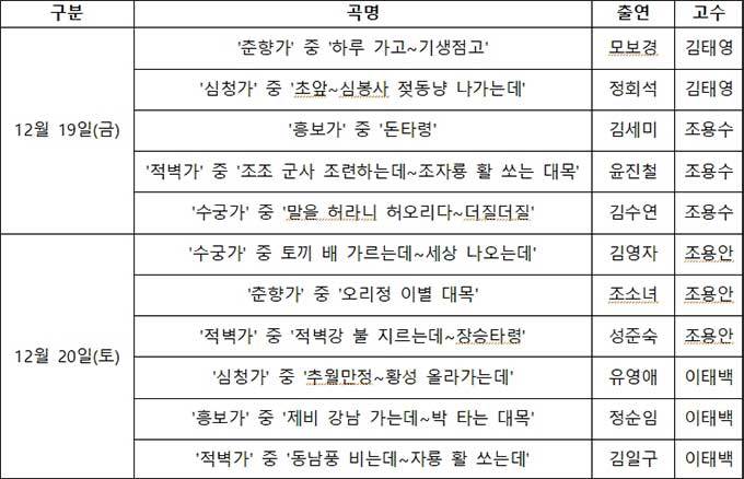 12월 19일(금)에는 김수연(국가무형유산 판소리 ‘수궁가’ 보유자), 윤진철(국가무형유산 판소리 ‘적벽가’ 보유자), 정회석(국가무형유산 판소리 ‘심청가’ 보유자), 김세미(전라북도무형유산 판소리 ‘수궁가’ 보유자), 모보경(전라북도무형유산 판소리 ‘춘향가’ 보유자) 명창이 출연하며, 고수로는 조용수, 김태영이 함께한다. 사회는 유영대, 정회천, 유은선이 맡는다.