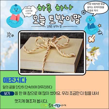 철이, 온이 겨울로 가득차는 온겨울달, 12월의 첫날입니다. 오늘 거리에는 딸랑거리는 구세군의 종소리가 울려 퍼지며 사랑의 온도를 높이기 비롯했습니다. 그런데 나라의 살림을 꾸리는 국회에서는 예산안 처리를 두고 팽팽한 줄다리기가 이어지고 있다는 기별이 들려옵니다. 해끝 바람빛(풍경)이 나눔과 다툼으로 갈리는 모습을 보니, 마음 한구석이 조금 쓸쓸해지기도 합니다. 온겨울달은 한 해를 마무리하는 달입니다. 이렇게 값진 때에 흐지부지한 끝맺음 대신, 야무지고 단단한 마무리를 해야 할 것입니다. 그래서 오늘 여러분과 나누고 싶은 토박이말은 바로 '매조지하다'입니다.