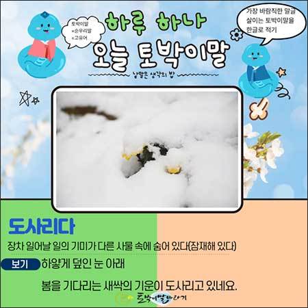 눈 내리는 겨울 바람빛(풍경)을 찍어 누리어울림마당(에스엔에스)에 올릴 때도 써 보세요. "하얗게 덮인 눈 아래 봄을 기다리는 새싹의 기운이 도사리고 있네요. 겉은 차가워 보여도 속은 참 뜨거운 겨울입니다."라고 적어보는 건 어떨까요? 읽는 이들의 마음까지 차분하고 단단하게 만들어 줄 것입니다.