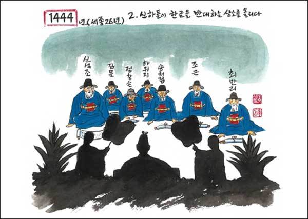 Two months after King Sejong the Great created Hangeul, in February 1444 (the 26th year of Sejong’s reign), an incident occurred where officials, including Choi Man-ri, Shin Seok-jo, Kim Mun, Jeong Chang-son, Ha Wi-ji, Song Cheo-geom, and Jo Geun, submitted a petition opposing the creation of Hangeul. They argued that the invention of Hangeul was contrary to Confucian values that honored China, that Hangeul would hinder scholarly advancement, and that the existence of innocent criminals was not because they were unable to read, but because the officials who handled them were not fair. In response, King Sejong emphasized that while it is important to follow China’s practices when necessary, it was also essential to preserve and protect Korea’s own culture. He stressed that the creation of Hangeul was not just for scholarly purposes, but was necessary for the convenience of the common people. Thus, King Sejong persuaded his officials and further prepared for the widespread adoption of Hangeul.