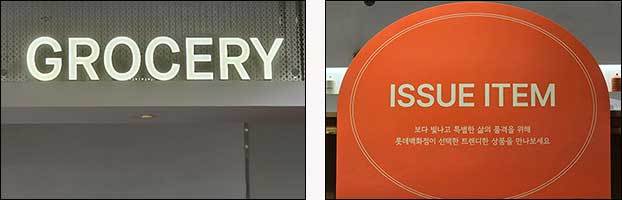 그 ‘FOOD AVENUE’를 주욱 돌아 나오니 이젠 식품점을 뜻하는 ‘GROCERY’라는 간판도 보입니다. 또 ‘ISSUE ITEM’도 있는데 아래에 작은 글씨로 “보다 빛나고 특별한 삶의 품격을 위해 롯데백화점이 선택한 트렌디한 상품을 만나보세요”라고 쓰여 있습니다. 이 간판 ‘GROCERY’도 역시 ‘먹거리가게’, ‘ISSUE ITEM’은 ‘유행상품’ 또는 ‘뜨는상품’ 이렇게 해도 좋지 않을까요? 롯데백회점 지하 1층을 아무리 둘러보아도 외국인으로 보이는 사람이 전혀 없는데도 꼭 이렇게 간판에 영어를 써야 하는지 이해가 안 됩니다.